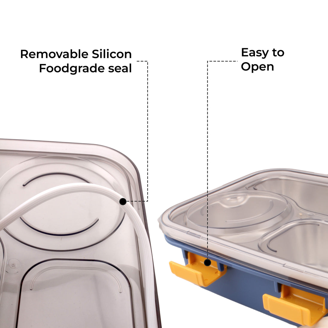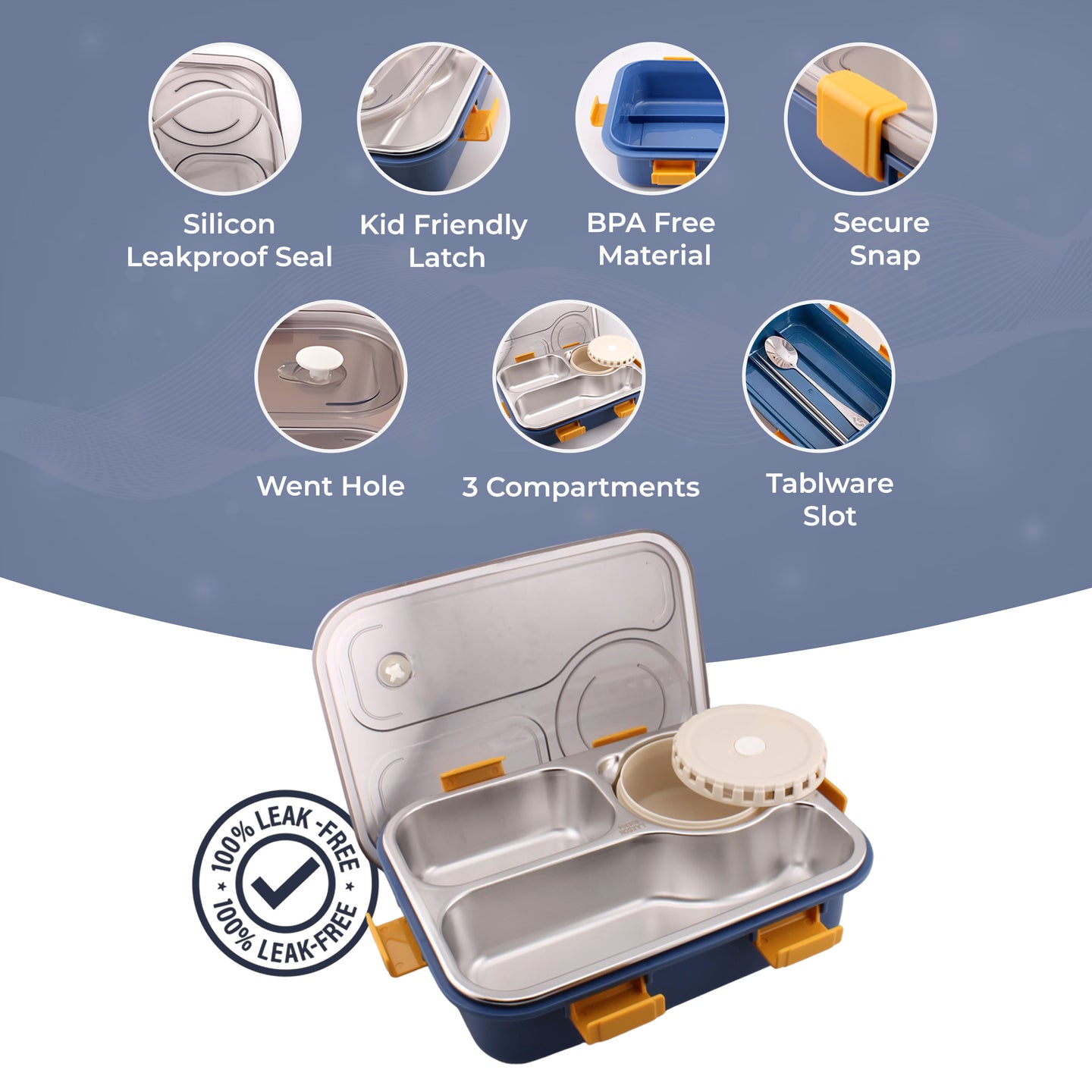 Cravista Stainless Steel Bento Blue Lunch Box with Soup Bowl | 3-Compartments Tiffin Box for Adults Kids