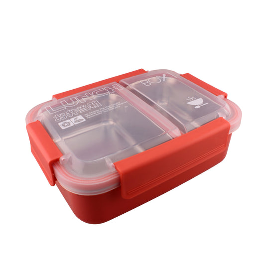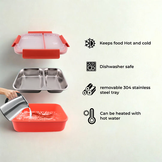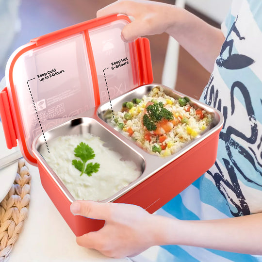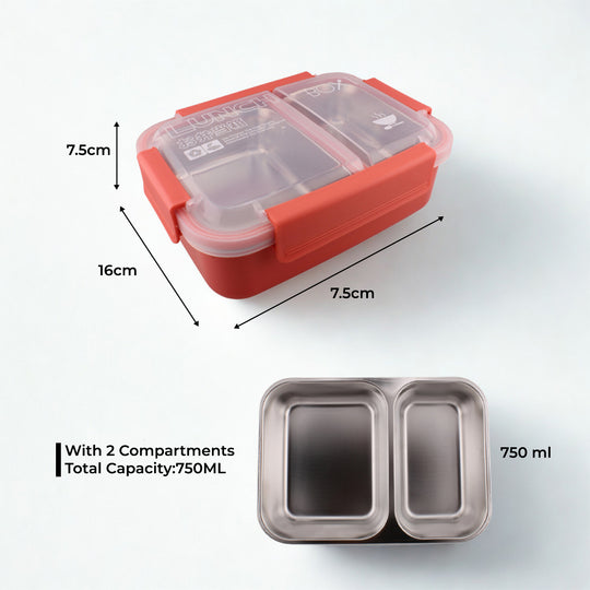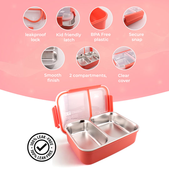 Cravista Stainless Steel 2 Compartments Orange Bento Lunch Box with Removable Inner Tray - Insulated, Leak Proof Bento Box for Kids