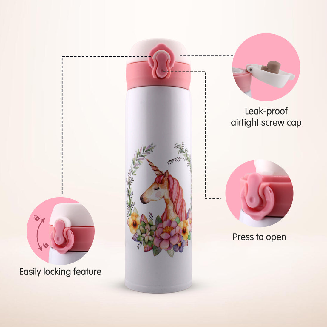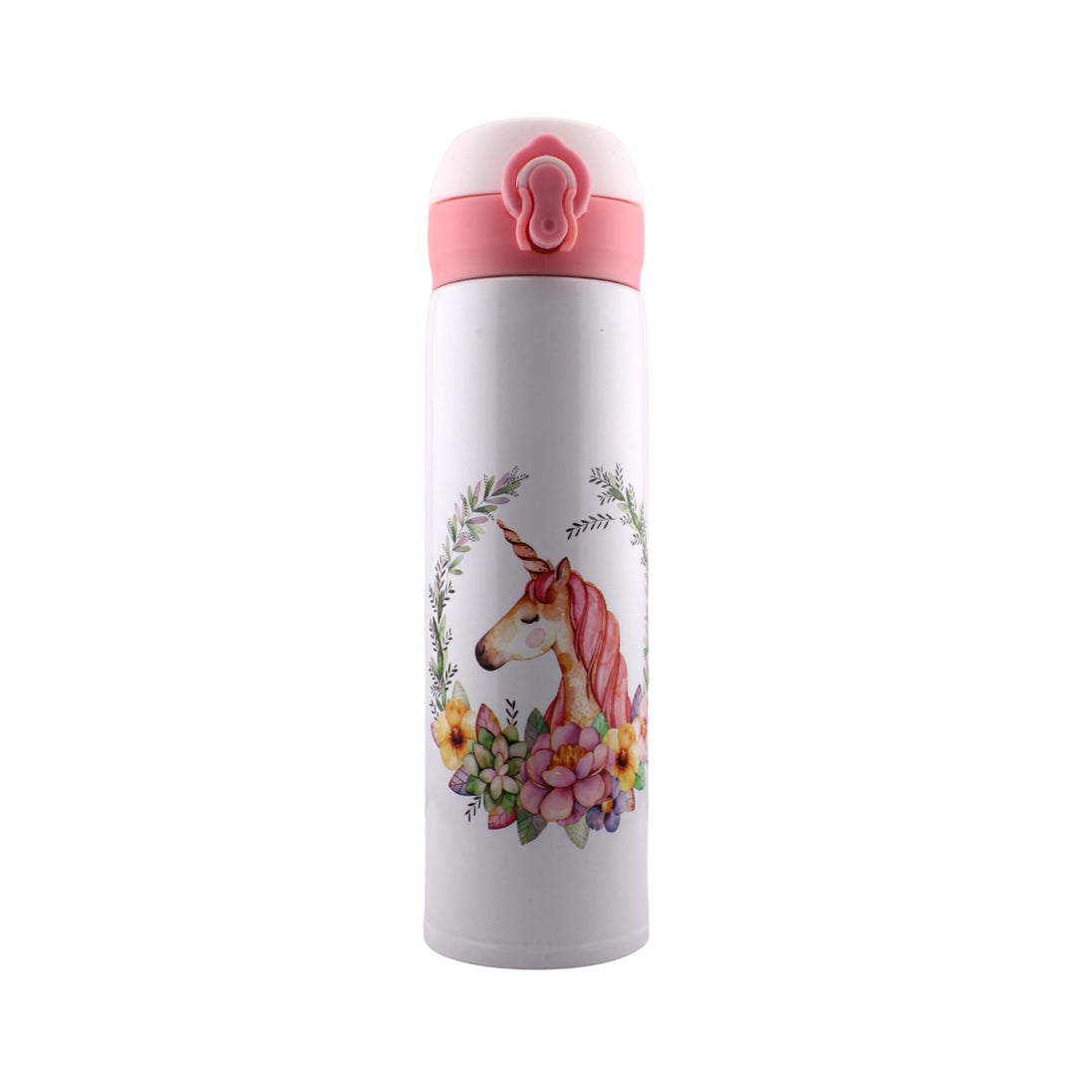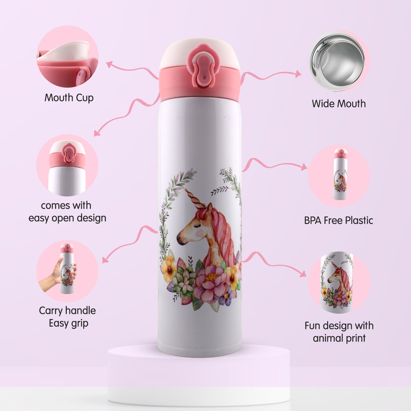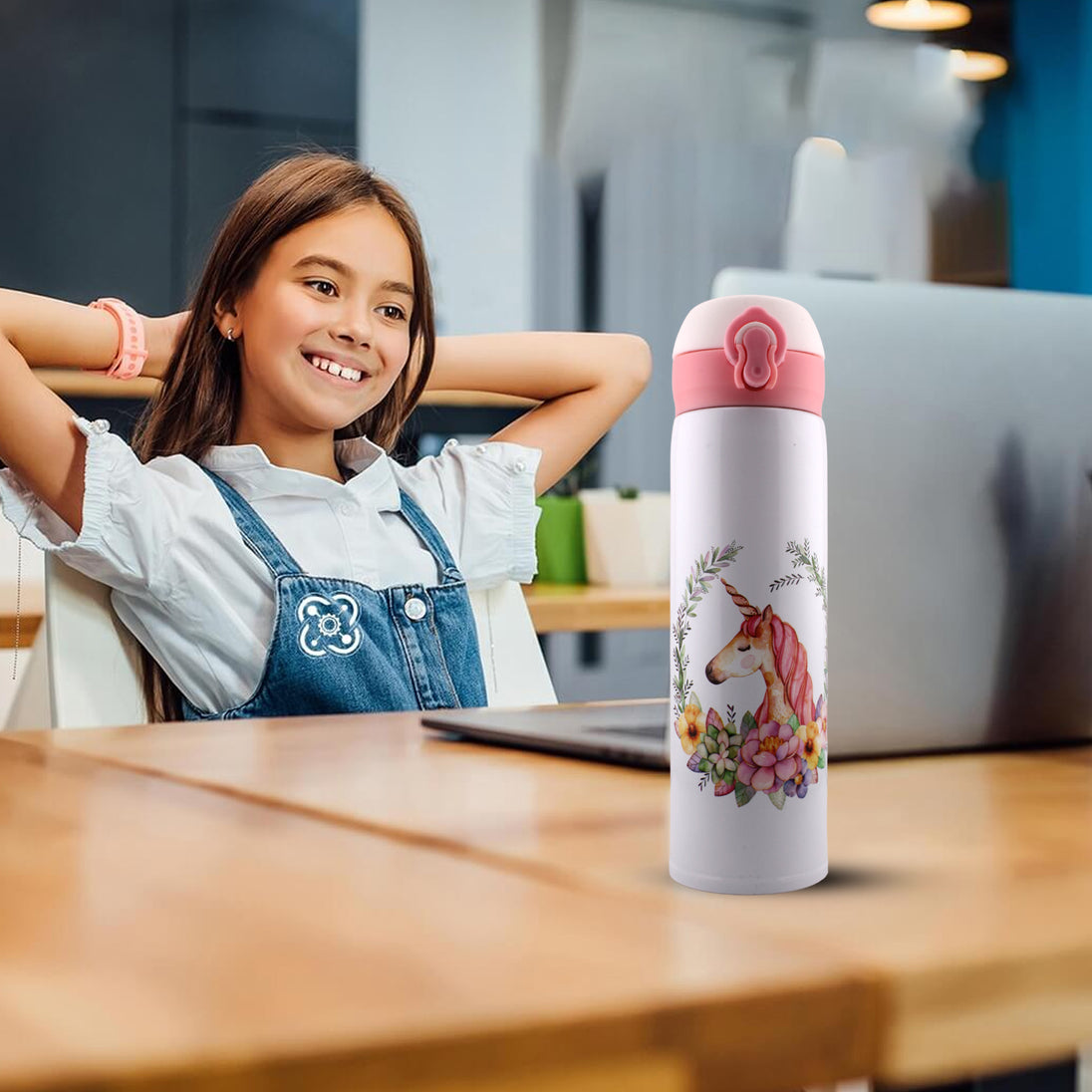 KIDS WATER BOTTLE: 1x 500ML Unicorn stainless steel double-wall vacuum insulated thermos bottle, perfect for young ones.