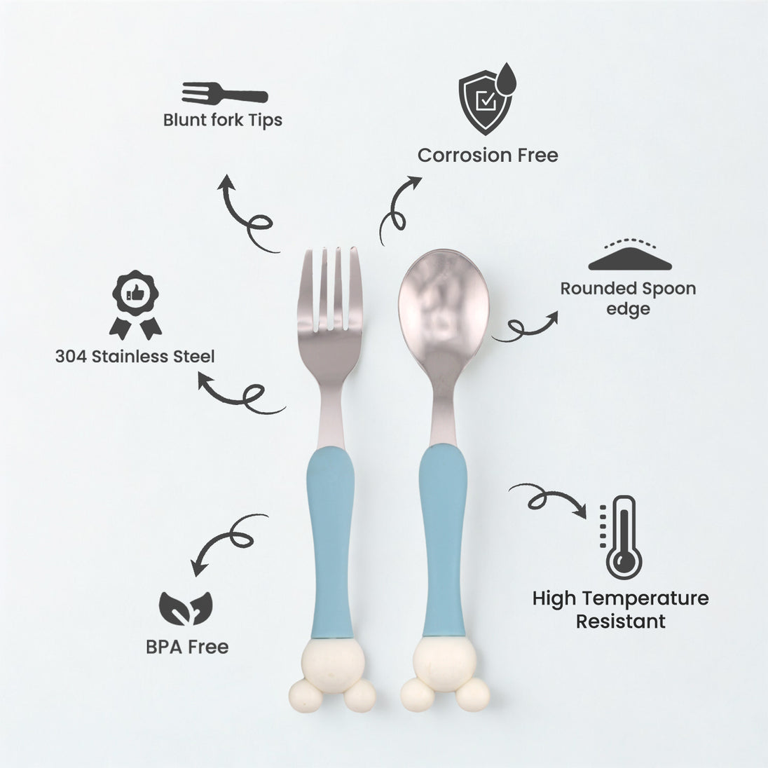 - ROUNDED EDGES: The rounded edges of the kids spoon and blunt tips of the fork from the kids cutlery set allows your little ones to use it easily whilst protecting their mouth, teeth, and gums.