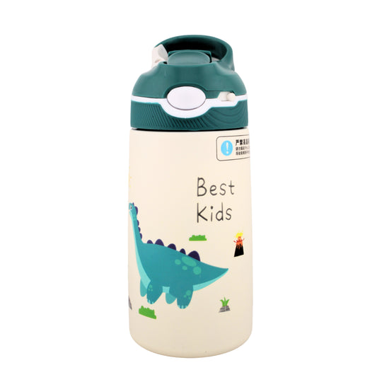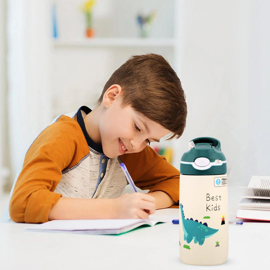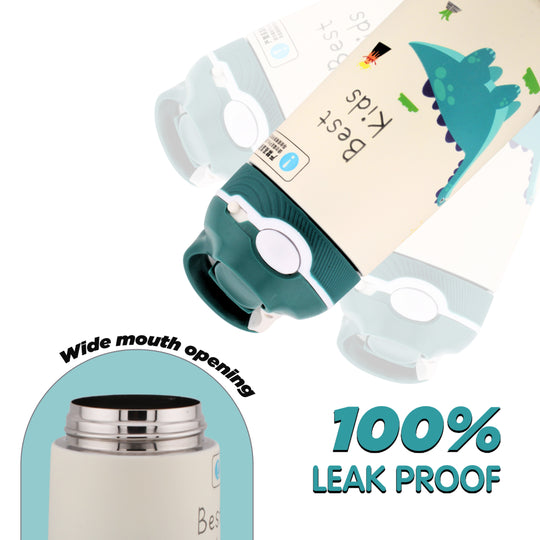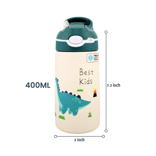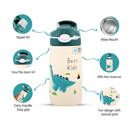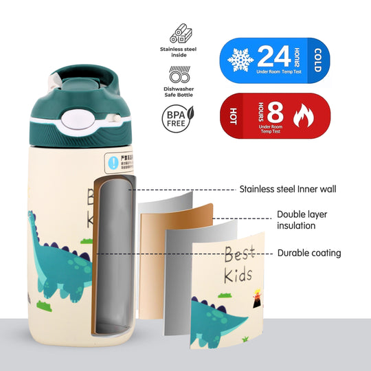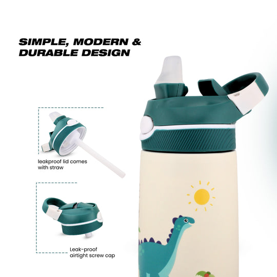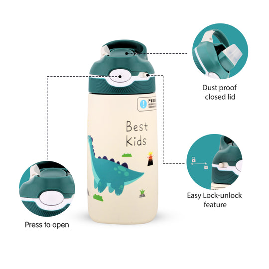 Cravista Stainless Steel Kids Water Bottle with Straw & Handle- Leakproof BPA Free Dinosaur Water Bottle (Green)