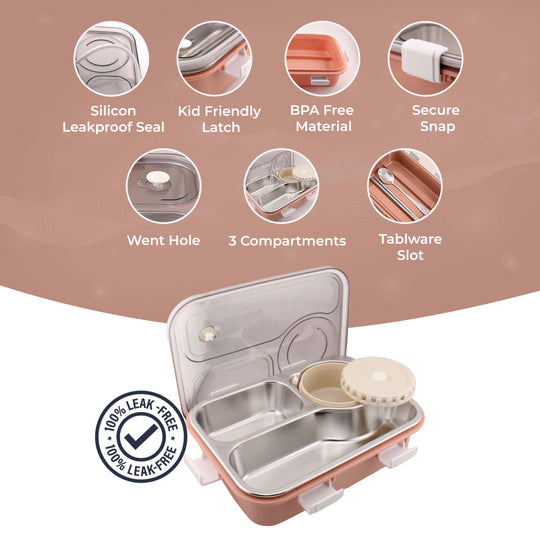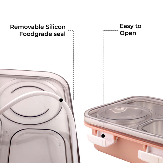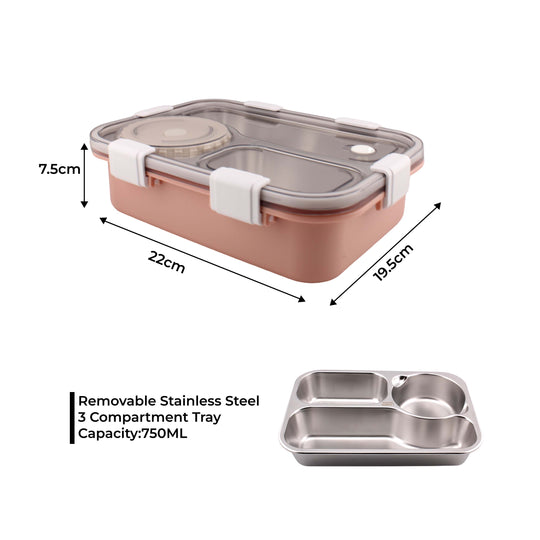 Cravista Stainless Steel Bento Pink Lunch Box with Soup Bowl | 3-Compartments Tiffin Box for Adults Kids