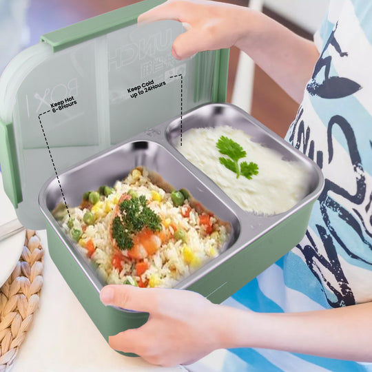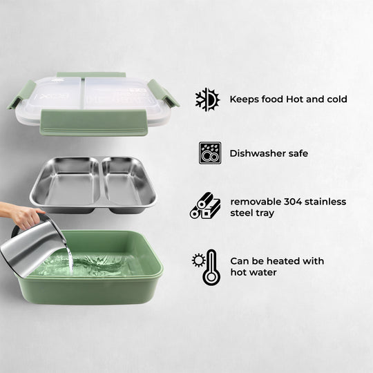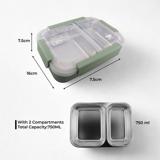 Cravista Stainless Steel 2 Compartments Green Bento Lunch Box with Removable Inner Tray - Leak Proof Bento Box for Kids, Adults