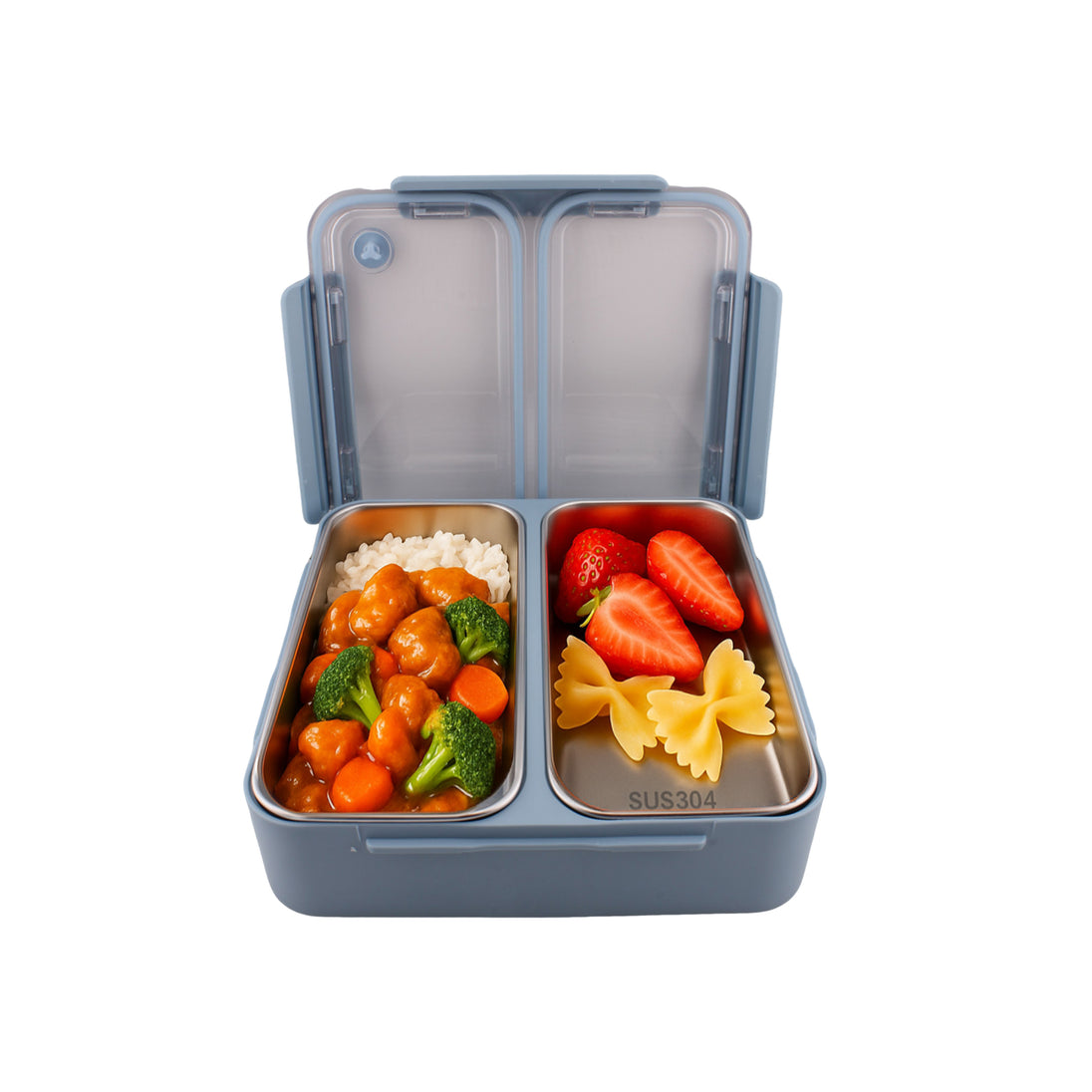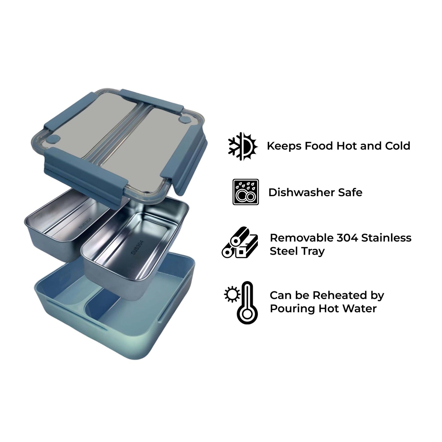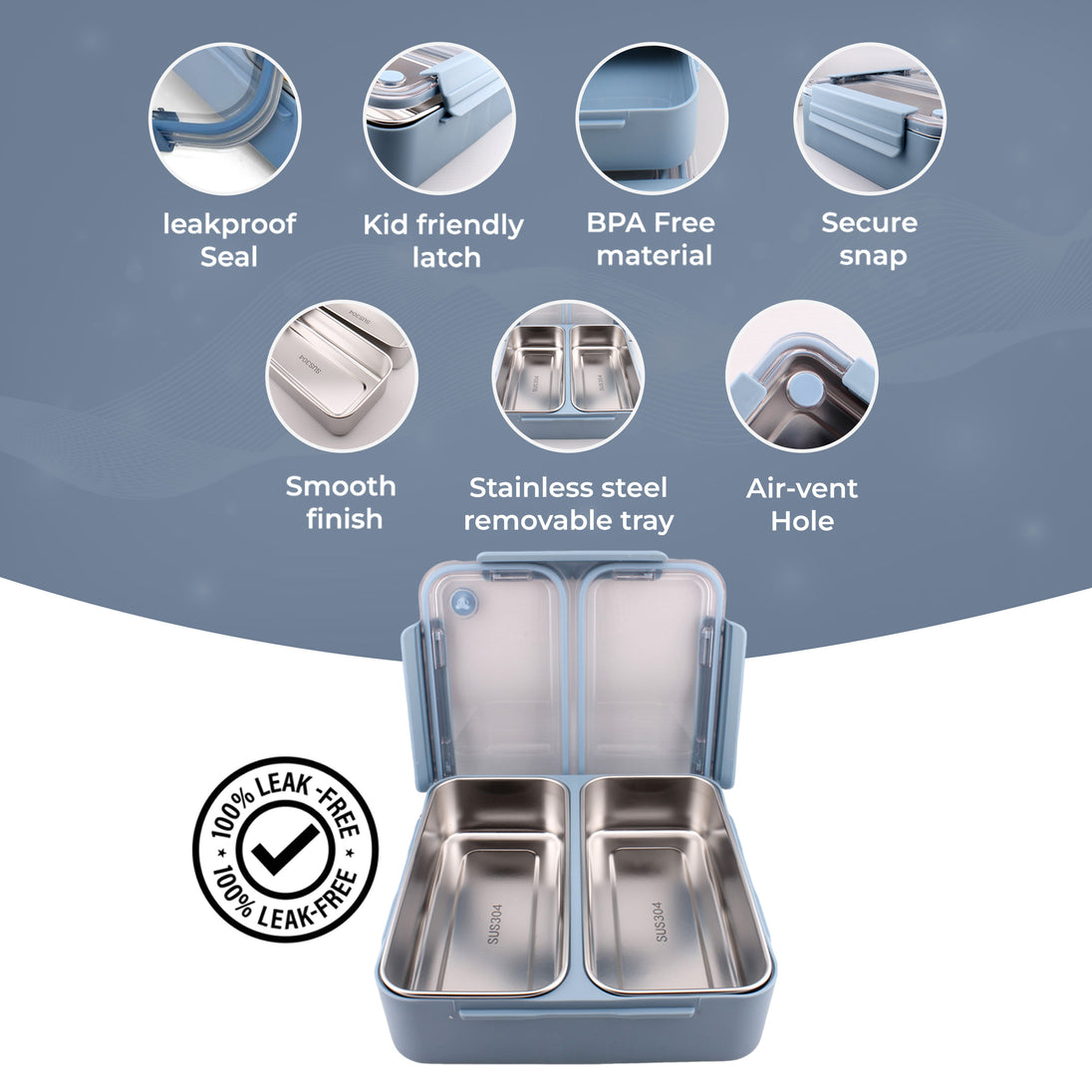 Cravista 2 Compartments Stainless Steel Blue Bento Lunch Box with Removable Inner Tray - Leak Proof Lunch Box for Kids