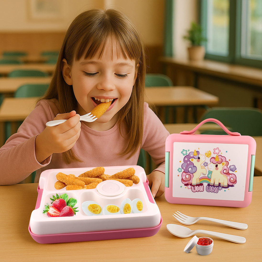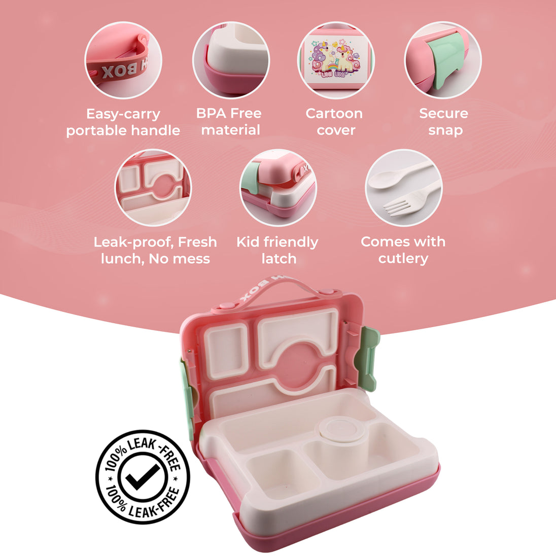 Cravista Unicorn Kids Bento Lunch Box -Leakproof, BPA-Free, Airtight Tiffin with Spoon & Fork- 4 Compartments (Pink)